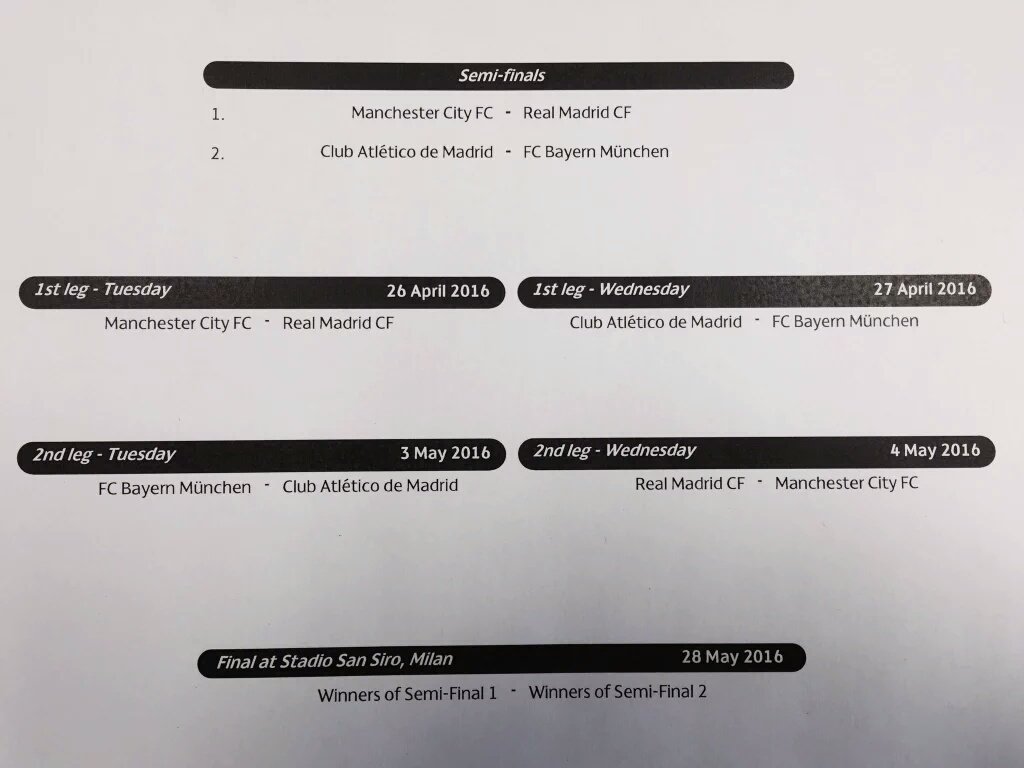 ويحل ريال مدريد ضيفًا على مانشستر سيتي في ملعب الاتحاد في 26 أبريل المقبل بينما يستقبل أتلتيكو مدريد خصمه بايرن ميونخ في الفيثنتي كالديرون في 27 من الشهر نفسه.