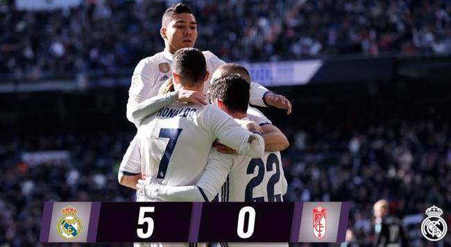 Goalna - تمكن ريال مدريد "بطل أوروبا والعالم" تحت قيادة زيدان من تحقيق انتصار آخر - وهذه المرة على غرناطة وبخماسية نظيفة - على ملعب سنتياغو بيرنابيو في الليغا ليواصل بذلك تهديد كافة الأرقام القياسية في عدم الهزيمة، وواصل تربعه على صدارة الدوري.