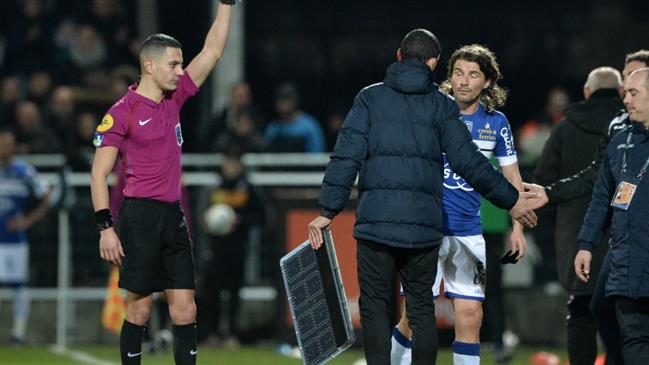SC Bastia's Yannick Cahuzac was sent off vs Angers for slapping the 4th official's board out of his hands. pic.twitter.com/LIMmuaqBMQ— Get French Football (@GFFN) ٢٧ فبراير، ٢٠١٧
