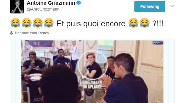 نشر أنطوان جريزمان نجم هجوم منتخب فرنسا وفريق أتلتيكو مدريد دليلا على تحيته لرافاييل فاران زميله في المنتخب، ومدافع ريال مدريد، الجار اللدود لفريقه، وتهنئته على تحقيق الملكي لقب دوري أبطال أوروبا.