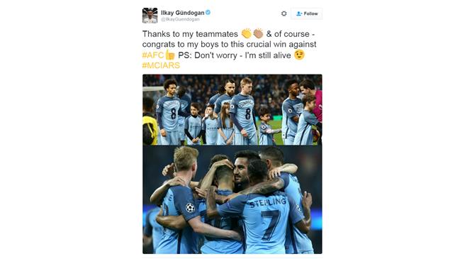 وطمأن جندوجان الجماهير في تغريدة نشرها على حسابه في موقع "تويتر" عقب مباراة أرسنال، قائلاً "أشكر زملائي، وبالطبع أهنئهم على الفوز الصعب على أرسنال. لا تقلقوا، ما زلت على قيد الحياة".