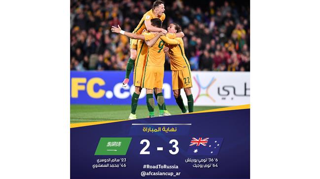 خسر المنتخب السعودي الأول أمام مضيفه الأسترالي 3-2 في المباراة التي جرت بينهما اليوم الخميس في الجولة الثامنة من التصفيات الآسيوية المؤهلة لمونديال روسيا 2018.